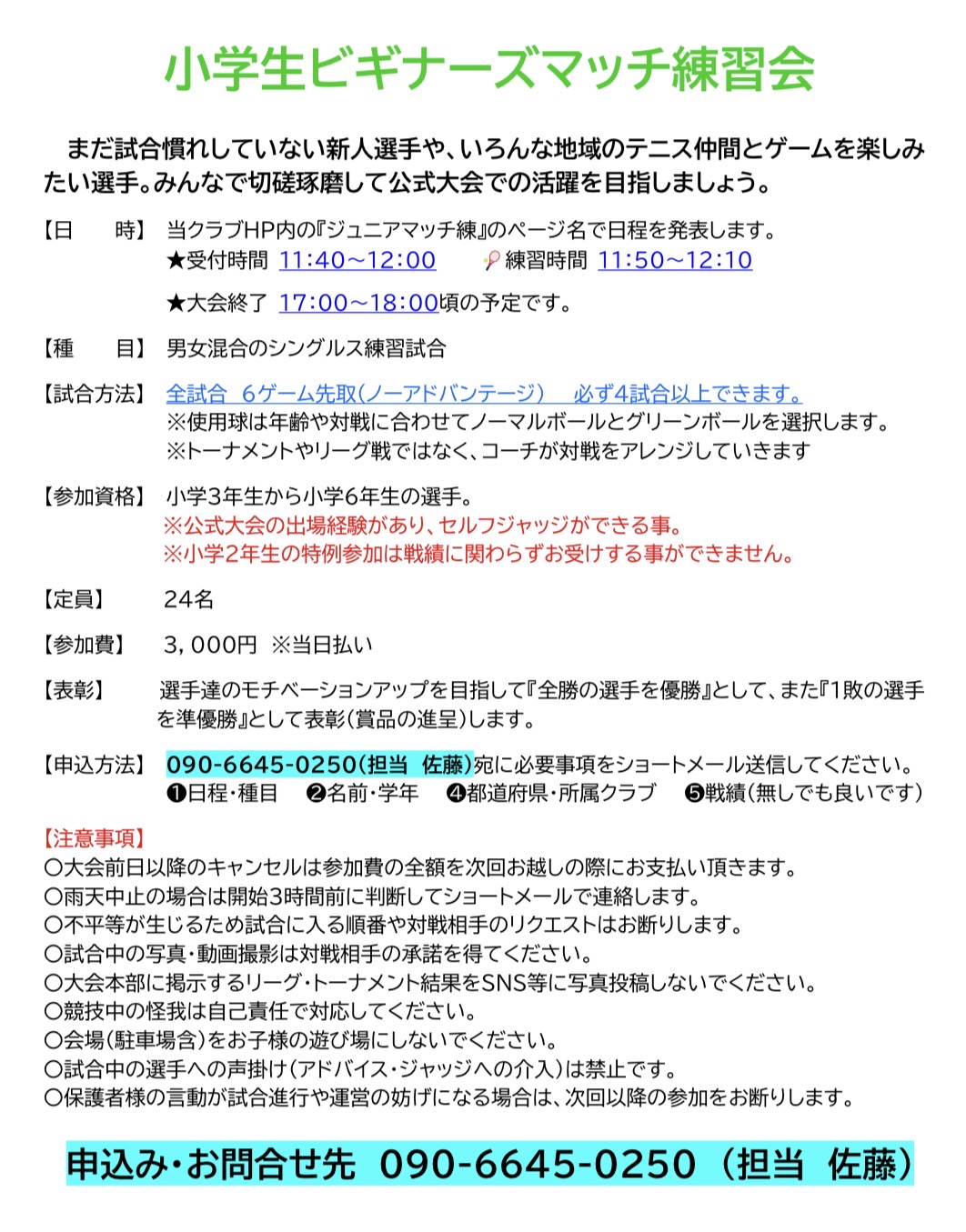 当クラブのジュニアチームは土曜日・日曜日に強化練習をしています。この強化練習を一緒に頑張ってくれる選手を募集します。練習内容は常時2~3名のコーチが指導に入り、テニスコート4~5面に分かれて課題練習やマッチ練習をしています。他県・他クラブの選手と一緒に取り組む事でお互いの選手にとって良い刺激となり、普段とは違う緊張感の中で質の高い練習ができると期待しています。
