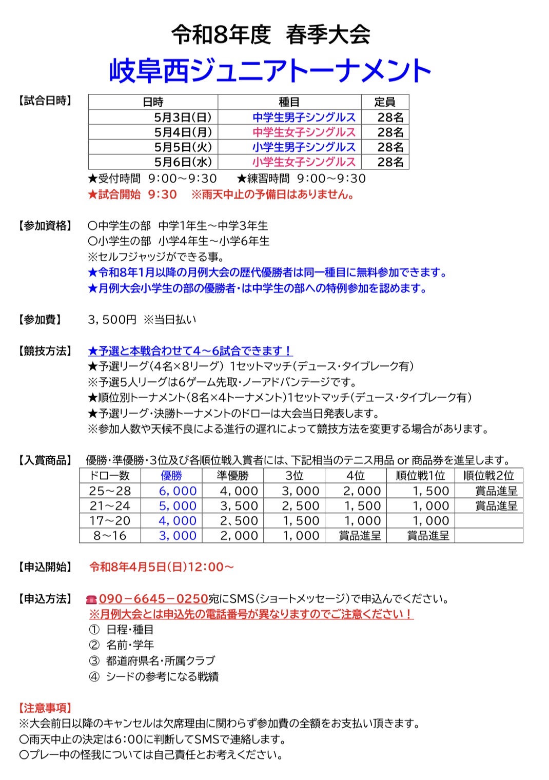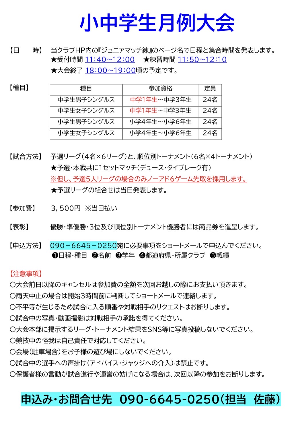 令和8年1月以降の月例大会の歴代優勝者は春季大会の同一種目に無料参加できます。また小学生の部の優勝・準優勝者は中学生の部に特例参加を認めます。